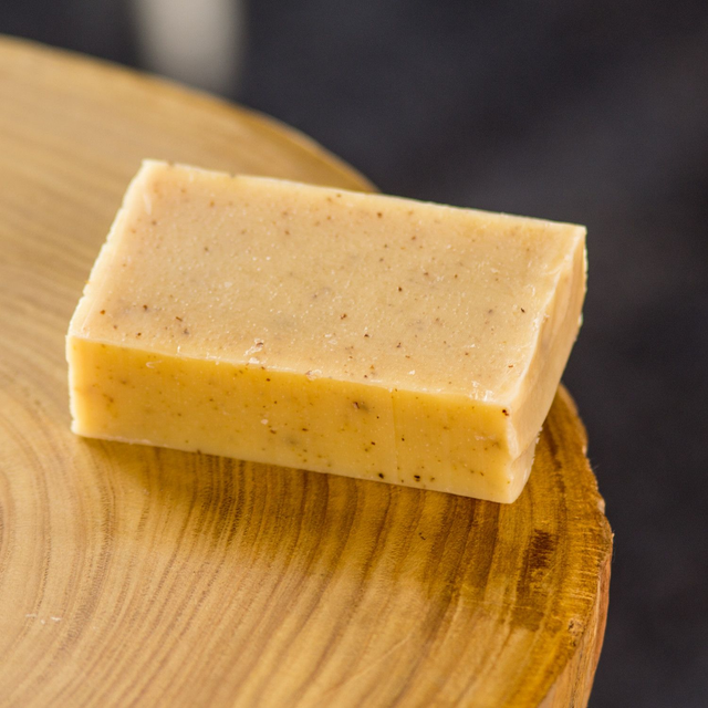 ingrédients: huiles saponifiées (olive*, saindoux, coco*, tournesol, cameline*), lait de brebis*, huile essentielle de cèdre*, graines de lin moulues, amandes en poudre